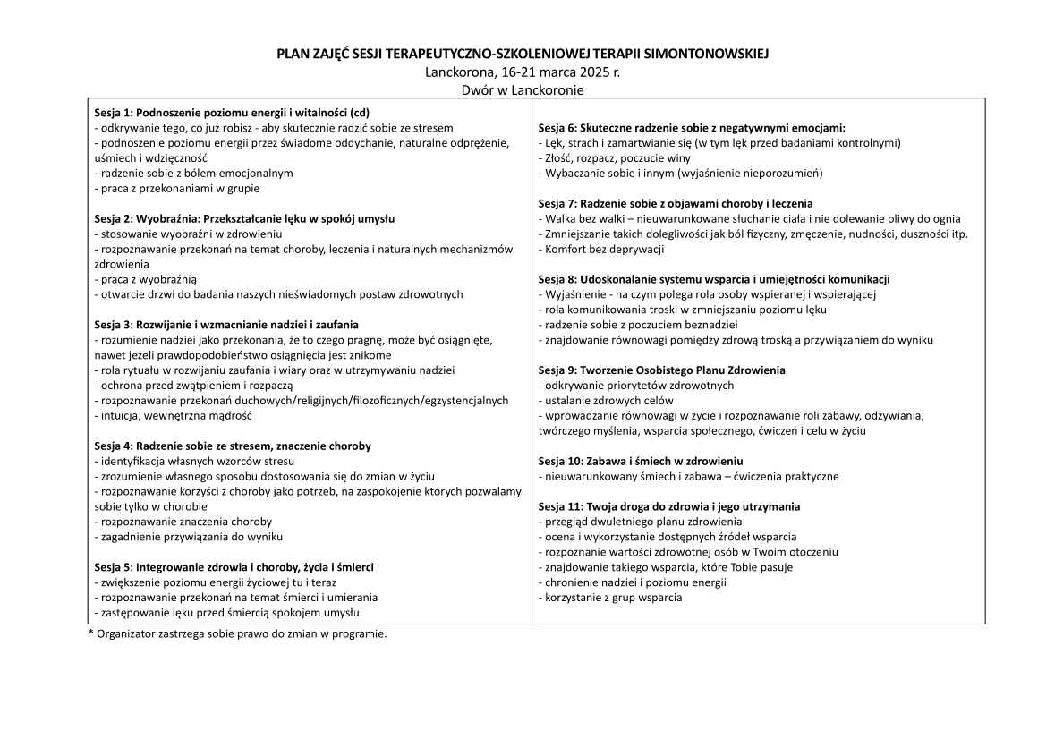 Serdecznie zapraszamy do Lanckorony na wiosenną sesję terapeutyczno-szkoleniową Terapii Simontonowskiej prowadzoną przez zespół trenerów i superwizorów.